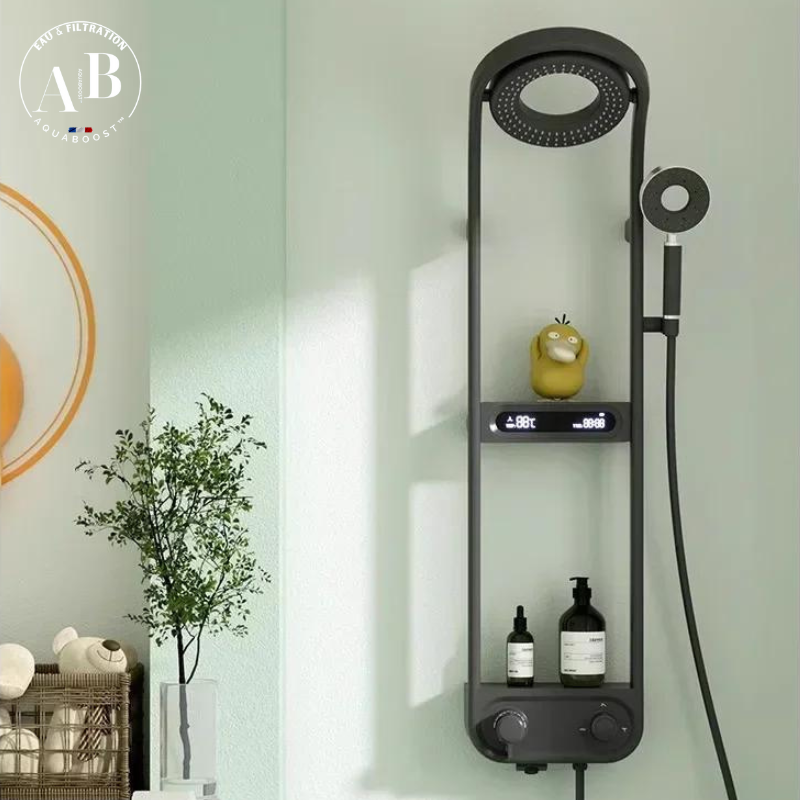 Écran digital intégré affichant la température de l’eau et le niveau d’usure du filtre.