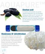 Avec son design épurée AQUAPURE™ est surtout équipée d'un filtre au charbon actif ainsi que d'un filtre UF (Ultrafiltration) garantissant une purification de l'eau en la rendant potable ou que vous soyez.
