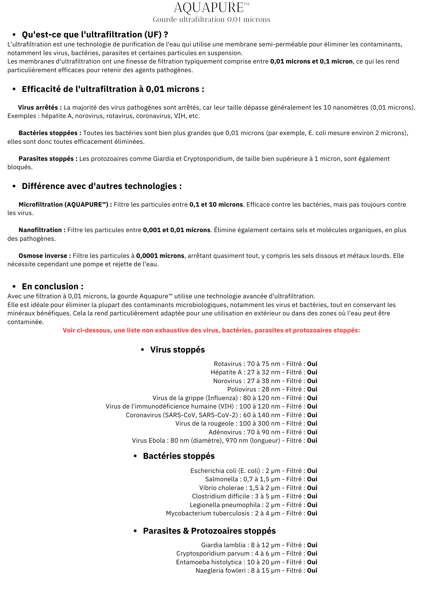 Grâce à son système de filtration en deux étapes, le filtre de la gourde AQUAPURE™ élimine efficacement les bactéries, virus, parasites protozoaires, ainsi que le chlore, les agents chimiques, les mauvais goûts et les odeurs. Il protège contre une variété de contaminants, y compris les micro-plastiques, la saleté et le sable, tout en améliorant le goût de votre eau.